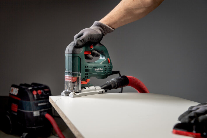 Універсальний лобзик з дуговою рукояткою для точного ведення під час пилянняВисокоточне розпилювання з урахуванням властивостей матеріалу завдяки регулюванню частоти ходів, маятниковому ходу та низькій напрямній пиляльного полотна з пружинними опорамиMetabo Quick для заміни пилкового полотна без інструментів, з автоматичним викидомДугова рукоятка з нековзкою накладкою SoftgripФункція видування стружки забезпечує вільну видимість зони розпилуПовнохвильова електроніка Vario-Constamatic (VC) для роботи з частотою ходів, що відповідає властивостям матеріалу та залишається майже незмінною під навантаженнямМожливість підключення універсального пилососаНезнімне захисне скло, що зсувається донизу, для ефективного відведення й захисту від стружки, що розлітається у всі бокиНапрямна шина і пристрій ведення постачаються окремо