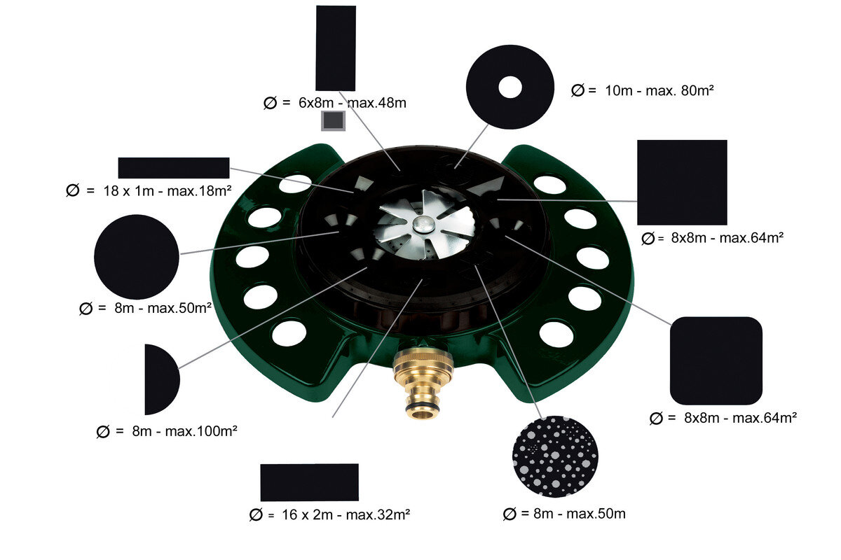 Стабільна металева конструкція для мобільного застосування та стійкості в роботіЗнімна сітка для захисту дощувальної установки від бруду та пошкодження піском та часточками брудуМуфтове з'єднання з латуні, сумісне з усіма стандартними системами насадокБагатофункціональний пристрій для поливання великих площин та невеликих палісадників9 типів зволоження поверхні - від кола або прямокутника до дрібнодисперсного тумануНеобхідна поверхня обирається за допомогою диска дощувальної установкиФорми зрошуваної поверхні:Коло Ø = макс. 10 м / 80 м²Півколо r = макс. 8 м / 100 м²Квадрат макс. 8 x 8 м / 64 м²Прямокутник макс. 16 x 2 м / 32 м²Приєднання:Накидна гайка, латунь, 3/4" внутрішня різьбаМуфтове з'єднання, латунь, 3/4" зовнішня різьба