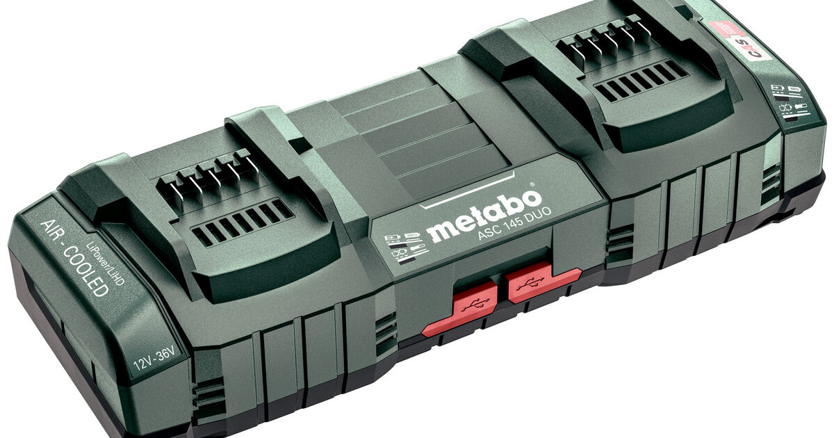Швидке заряджання для обох: подвійний швидкозарядний пристрій для всіх акумуляторних блоків зі слайдовим кріпленням усіх класів напруги (12–36 В)Акумуляторні блоки заряджаються в 4 рази швидше, ніж за допомогою зарядного пристрою початкового рівняЗапатентована технологія заряджання «AIR COOLED» забезпечує короткий час заряджання завдяки охолодженню акумуляторного блока в процесі заряджанняОптимальний зв’язок між акумуляторним блоком і зарядним пристроєм для максимального терміну служби акумуляторних блоківДва USB-з'єднувачі із зарядним струмом 1,5 А кожен3 роки гарантії на всі акумуляторні блоки і зарядні пристрої Metabo незалежно від кількості циклів заряджанняБагато марок, одна акумуляторна система: Зарядний пристрій для заряджання всіх акумуляторних блоків марок CAS: