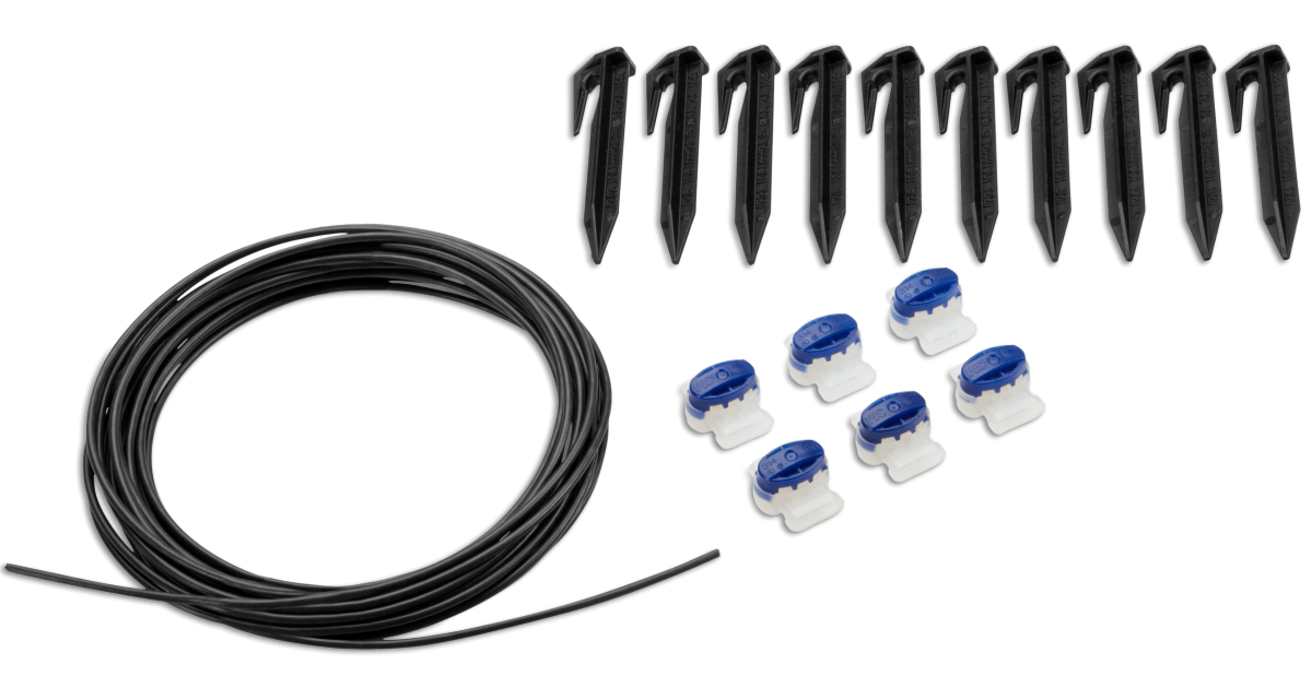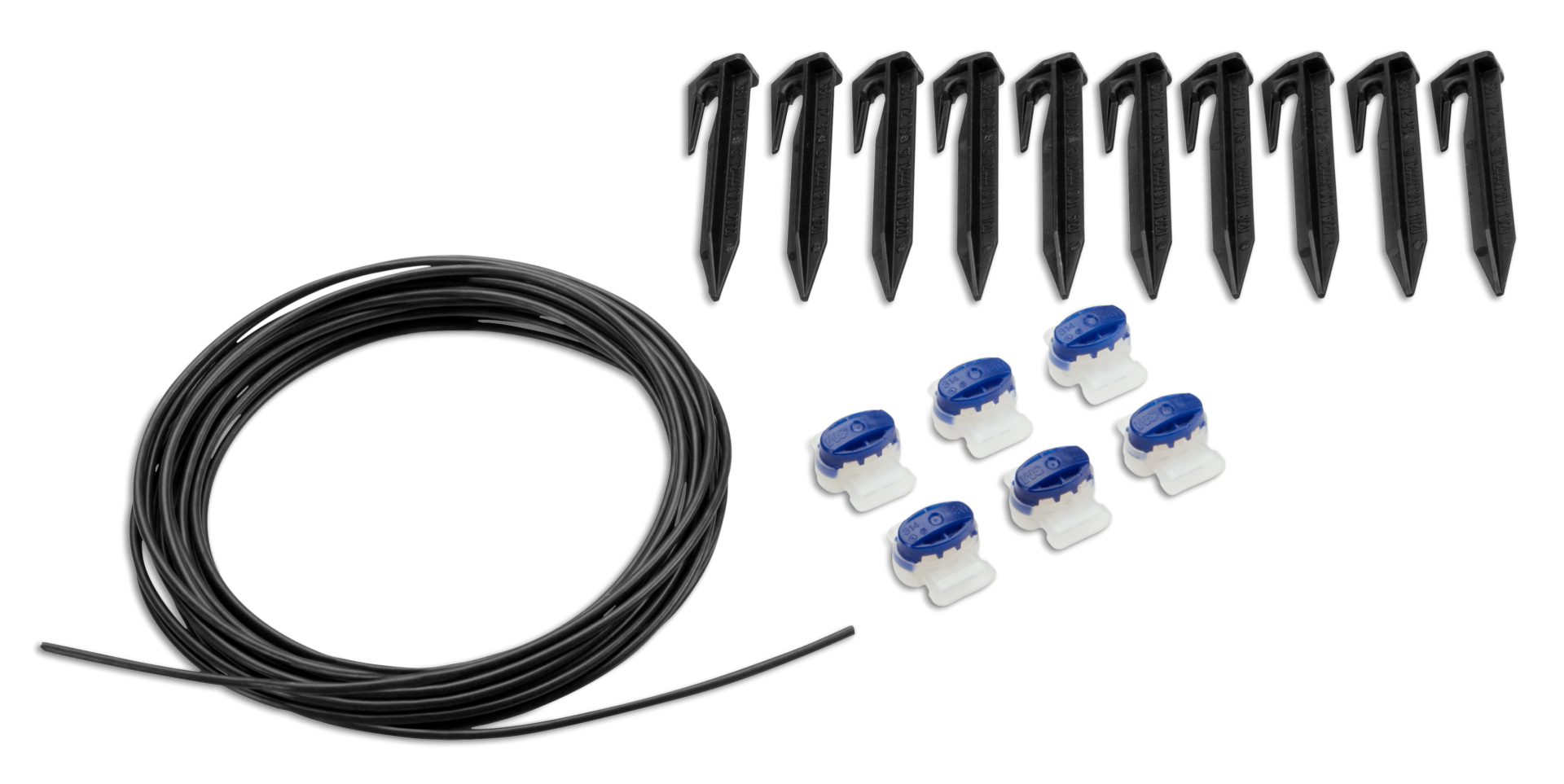 Якщо випадково трапиться механічне пошкодження обмежувального дроту, це ідеальний комплект для усунення дрібних обривів. Набір також дуже зручний, якщо вам потрібно змінити форму контуру через незначні зміни площі газону. Включає 5-метрів обмежувального дроту, 6 муфт та 10 кілочків.