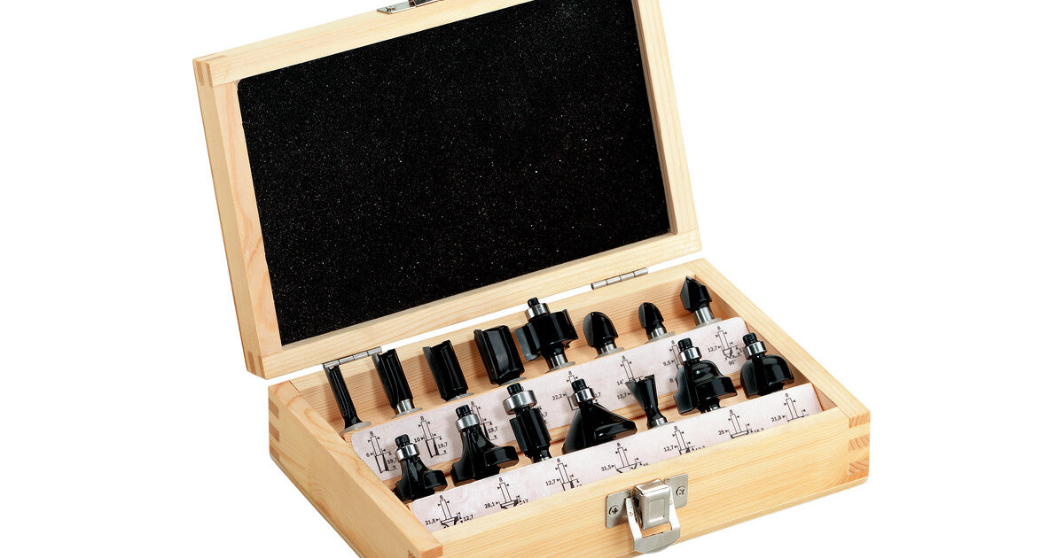 Склад: пазова фреза, 4 шт.: 6 мм; 10 мм; 12 мм; 16 мм; фреза для вибірки канавки, 3 шт.: 12,7 мм, R 6,3 мм; 9,5 мм; R 4,8 мм; 21,8 мм; R 6,3 мм; фреза для зняття фаски/вибірки врівень, 1 шт.: 31,5 мм; 45°; пазова фреза для V-подібних пазів, 1 шт.: 12,7 мм; 14°; фреза для заокруглення крайок, 2 шт.: 28,1 мм; R 9,5 мм; 21,8 мм; R 6,3 мм; фреза для вибірки врівень, 1 шт.: 12,7 мм; фреза "хвіст ластівки", 1 шт.: 12,7 мм; 14°; профільна фреза, 1 шт.: 25 мм; R 4,5 мм; фальцова фреза, 1 шт.: 22,2 мм