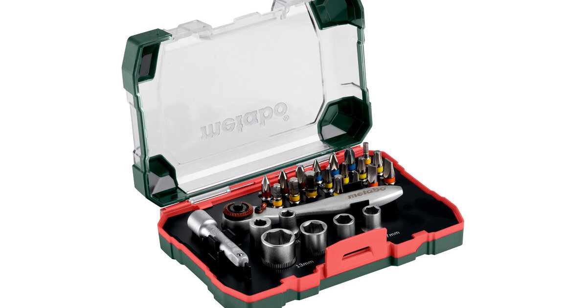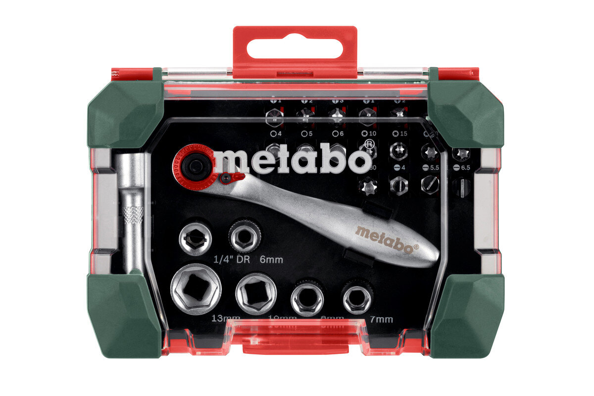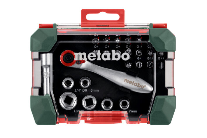 Складається з: Інструментальні насадки S 2L= 25 мм (18 шт.): по 1 x PH 1, PH 2, PH 3; PZ 1, PZ 2, PZ 3; H 3, H 4, H 5, H 6; T 10, T 15, T 20, T 25, T 30; SL 4, SL 5,5, SL 6,5Торцеві ключі (6 шт.): по 1 x 1/4", 6 мм, 7 мм, 8 мм, 10 мм, 13 мм1 x подовжувач; 1 x тримач з реверсомІнструментальні насадки з хромованадієвої сталі (якість S2); насадки з кольоровим кодуванням: для швидкого та простого знаходження потрібної насадки; високоякісна тріскачка; торцевий ключ із хромованадієвої сталі; високоякісна міцна коробка спеціальної конструкції Metabo; кріплення з отворами євростандарту