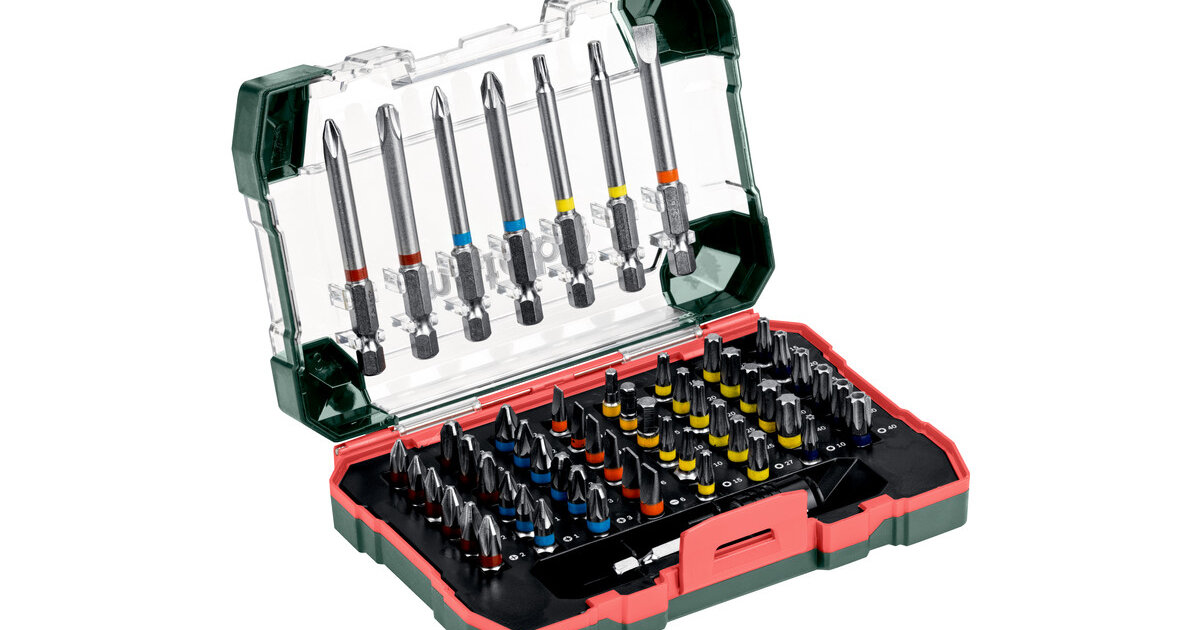 Складається з: Інструментальні насадки S 2L= 25 мм (48 шт.): PH 1 x 3, PH 2 x 3, PH 3 x 3; PZ 1 x 3, PZ 2 x 3; PZ 3 x 3; SL 4 x 2, SL 5 x 2, SL 6 x 2; H 3 x 1, H 4 x 1, H 5 x 1; T 10 x 2, T 15 x 2, T 20 x 2, T 25 x 2, T 27 x 2, T 30 x 2, T 40 x 2; для гвинтів Torx-Tamper: T 10 x 1; T 15 x 1; T 20 x 1; T 25 x 1; T 27 x 1; T 30 x 1; T 40 x 1L= 75 мм (7 шт.): PH 2 x 1, PH 3 x 1; PZ 1 x 1, PZ 2 x 1; T 20 x 1, T 25 x 1; SL 6 x 11 магнітний тримач швидкозмінних насадокІнструментальні насадки з хромованадієвої сталі (якість S2); інструментальні насадки з кольоровим кодуванням: для швидкого та легкого пошуку потрібної насадки; магнітний швидкозмінний перехідник; високоякісна міцна коробка спеціальної конструкції Metabo, з висувною підвіскою з отворами євростандарту