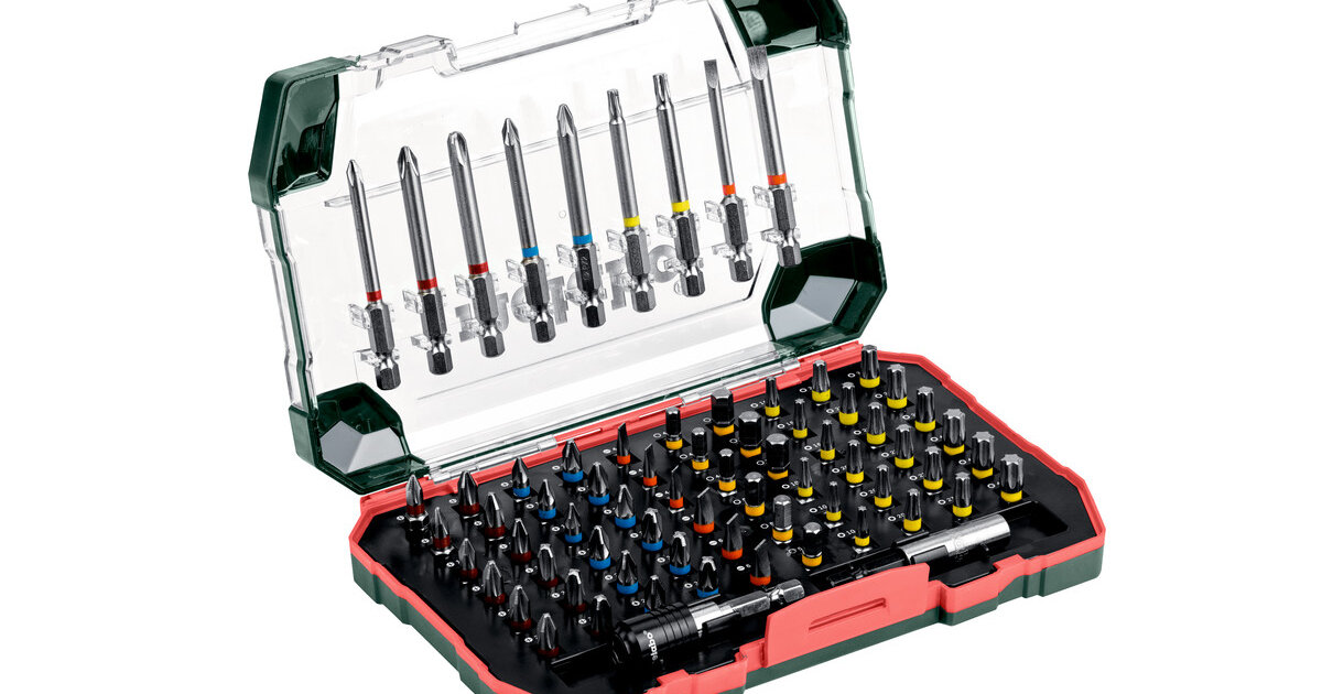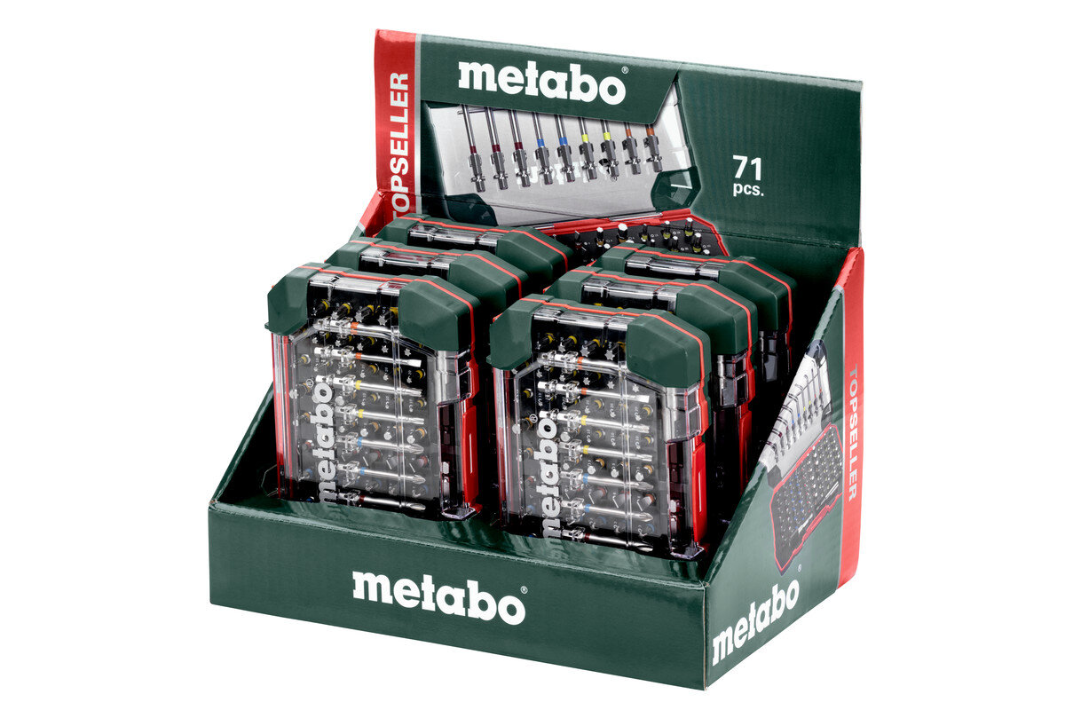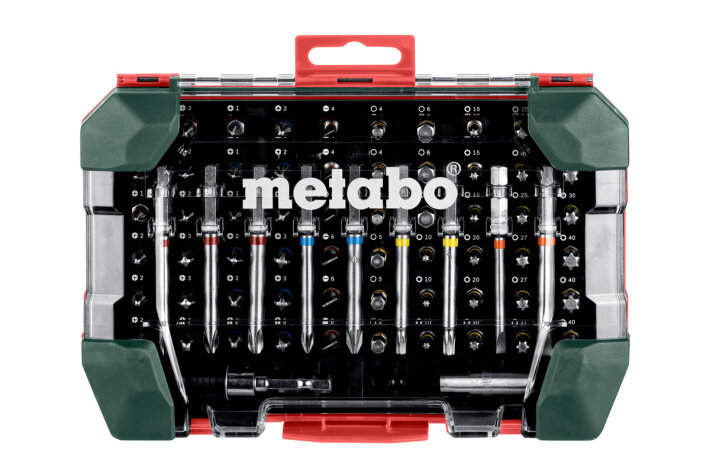 Складається з: Інструментальні насадки S 2L= 25 мм (60 шт.): PH 1 x 3, PH 2 x 6, PH 3 x 3; PZ 1 x 3, PZ 2 x 6, PZ 3 x 3; SL 4 x 3, SL 6 x 3; H 4 x 3, H 5 x 3, H 6 x 3; T 10 x 3, T 15 x 3, T 20 x 3, T 25 x 3, T 27 x 3, T 30 x 3, T 40 x 3L= 75 мм (9 шт.): по 1 x PH 1, PH 2, PH 3; PZ 1, PZ 2; SL 4, SL 6; T 20, T 251 x магнітний тримач інструментальних насадок; 1 x швидкозмінний магнітний тримач для інструментальних насадокІнструментальні насадки з хромованадієвої сталі (якість S2); насадки з умовним пофарбуванням; для швидкого та простого знаходження потрібної насадки; магнітний швидкозмінний тримач для інструментальних насадок + магнітний тримач інструментальних насадок; високоякісний міцний футляр спеціального дизайну Metabo, висувне кріплення з отворами євростандарту