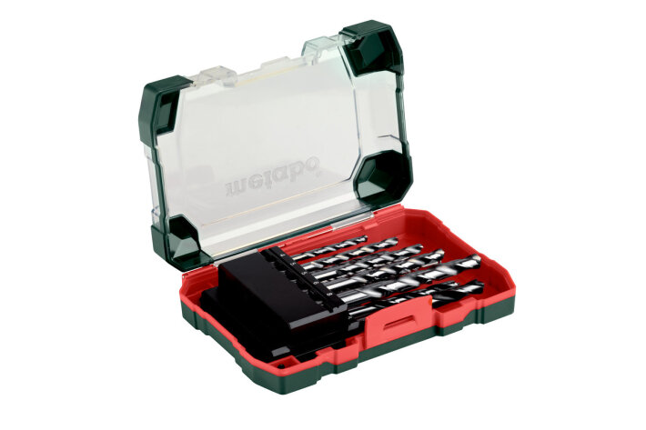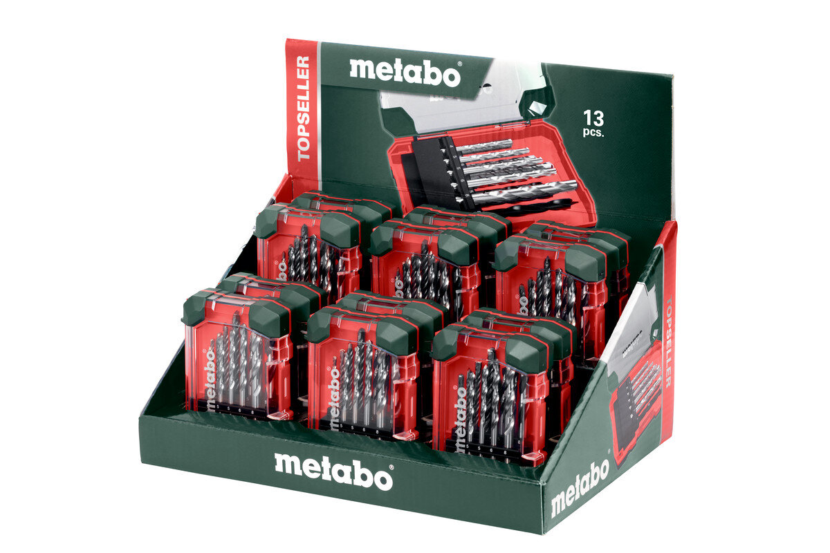 Свердло по металу з високосортної швидкорізальної сталі згідно з DIN 338, після роликового прокатування, циліндричне, праворізне, тип N, підходить для свердління сталі, кольорових металів, легованого і нелегованого сталевого литва. Опір розриву до 900 Н/мм²Свердло по каменю для звичайних і ударних дрилів; фрезероване виконання, твердосплавна пластина 130°, для свердління цегли, цегляної кладки, натурального каменю тощоСвердло по дереву з високоякісної сталі, загартоване, з центрувальним вістрям. Для свердління твердих та м’яких порід деревини, фанери, ДСП тощо13 предметів, у міцній коробціСвердла по металу (HSS-G) 1 x Ø 4 x 62 / 2 x Ø 5 x 75 / 1 x Ø 6 x 92 / 1 x Ø 8 x 117 мм; свердла по дереву 1 x Ø 4 x 74 / 5 x 85 / 6 x 92 / 8 x 117 мм; свердла по каменю 1 x Ø 4 x 75 / 5 x 85 / 6 x 100 / 8 x 120 мм