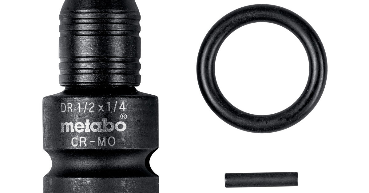 Ударний адаптер, 3 предмети (зі стопорним кільцем і штифтом), з внутрішнім чотиригранником 1/2“ з боку машини та внутрішнім шестигранником 1/4“ для стійких до ударів вставних інструментів з хвостовиком 1/4“