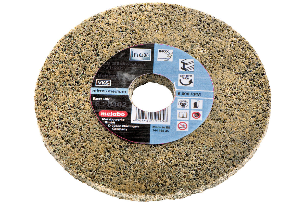 Багатошаровий пресований повстяний матеріал, наповнений абразивними зернами, залитими в синтетичну смолу (цирконієвий корунд)Завдяки додаванню абразивного зерна дозволяє виконувати різні роботи, від видалення ґратів до м'якої та різноманітної фінішної обробки. Придатний для видалення ґратів, шліфування зварювальних швів, прецизійного чищення та фінішної обробки поверхонь.Для легованої та високолегованої сталі, кольорових та легких металів, хромової та нікелевої сталі, титана, сталіМожливе профілювання шліфувального засобу для прецизійної роботи. Дуже мала глибина нерівностей матеріалу, що обробляється.Отвір 22,23 мм (для кутової шліфувальної машини)Макс. 10 000 об/хв; рекомендоване: 3 000 об/хв